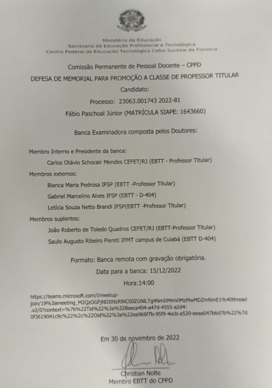 PROCLAMA FABIO PASCHOAL JUNIOR - Data:15/12/2022 as 14:00 Formato: Remoto - Link Reunião - Clique para ingressar na reunião