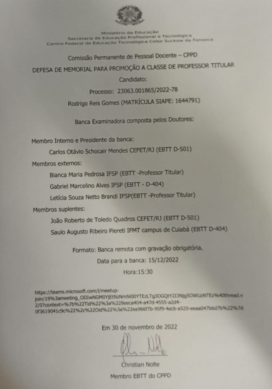 PROCLAMA RODRIGO REIS GOMES - Data:15/12/2022 as 15:30 Formato: Remoto - Link Reunião - Clique para ingressar na reunião