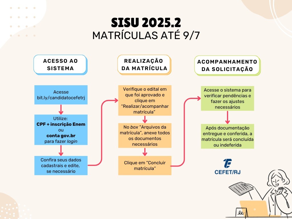 24/01/2025 - Pede-se às(aos) candidatas(os) que atentem-se cuidadosamente para o ANEXO I do EDITAL nº 01/2025, pois o referido anexo define o CRONOGRAMA do processo seletivo do SISU 2025 no âmbito do Cefet/RJ.