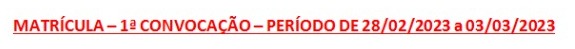 3 – O PERÍODO DE MATRÍCULA, CONFORME DISPOSTO NO AVISO ANTERIOR, ESTÁ PREVISTO PARA TER INÍCIO EM 28/02/2023, TODAVIA, PEDIMOS QUE FIQUEM ATENTOS A ESTA PÁGINA PORQUE, DE ACORDO COM O EDITAL nº 01/2023 (VIDE ART. 29), ESSA DATA PODERÁ SER ALTERADA, POR EXEMPLO, EM RAZÃO DE CIRCUNSTÂNCIAS DE ORDEM TÉCNICA.
