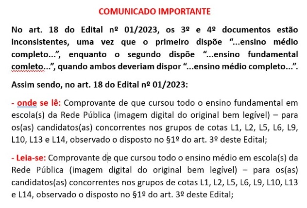 LEMBRAMOS AOS CANDIDATOS QUE A LEITURA DO EDITAL nº 01/2023 É MUITO IMPORTANTE (CLIQUE AQUI PARA ACESSAR O CITADO EDITAL), EM ESPECIAL AO QUE SE ACHA DISPOSTO EM SEUS ARTIGOS 17 E 18, UMA VEZ QUE SÃO RELATIVOS À ETAPA DE MATRÍCULA.