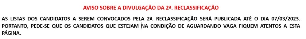 AS LISTAS COM AS MATRÍCULAS HOMOLOGADAS (CONFIRMADAS) DA 1ª. RECLASSIFICAÇÃO SERÃO PUBLICADAS NESTA PÁGINA EM ATÉ 3 (TRÊS) DIAS APÓS O DIA 01/03/2023 (DATA EM QUE SE ENCERRA O PERÍODO DE MATRÍCULA DESSA FASE DO PROCESSO SELETIVO). PORTANTO, SOLICITAMOS, POR GENTILEZA, QUE FIQUEM ATENTOS(AS) A ESTA PÁGINA.