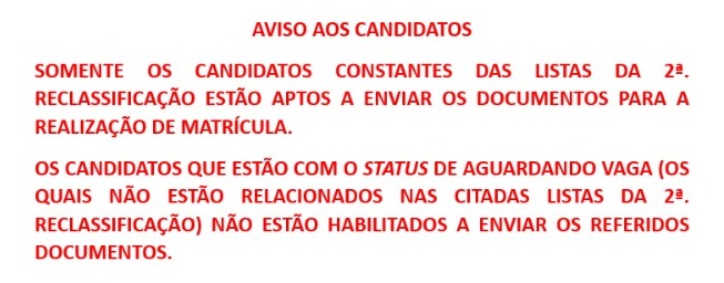 Em razão do remanejamento de vagas ociosas dos quadros V, VI, VII, VIII e IX, por falta de candidatos, a convocação para matrícula da 1ª. Reclassificação está sendo realizada com base nas notas finais dispostas na lista de classificação final dos candidatos.