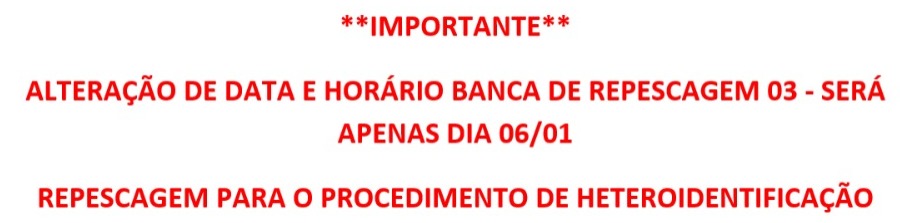 ALTERAÇÃO DE DATA E HORÁRIO BANCA DE REPESCAGEM 03 - SERÁ APENAS DIA 06/01 - REPESCAGEM PARA O PROCEDIMENTO DE HETEROIDENTIFICAÇÃO (04/01/2024): Arquivo