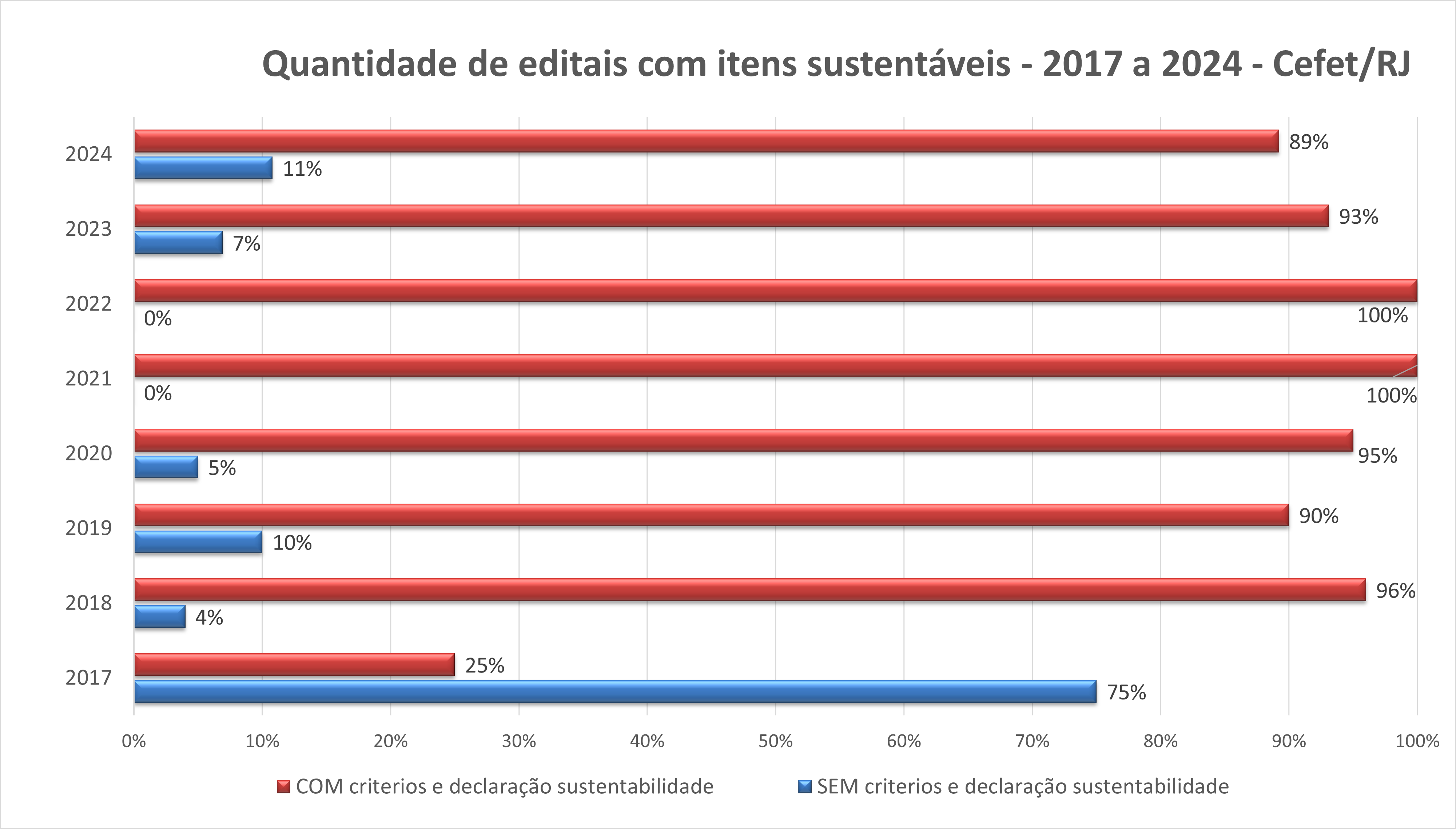Desde o ano de 2017, realiza-se o acompanhamento da presença de critérios de sustentabilidade nos termos de referência/ projeto básico que se encontram nos editais/licitações sustentáveis construídos pelos campi do Cefet/RJ.