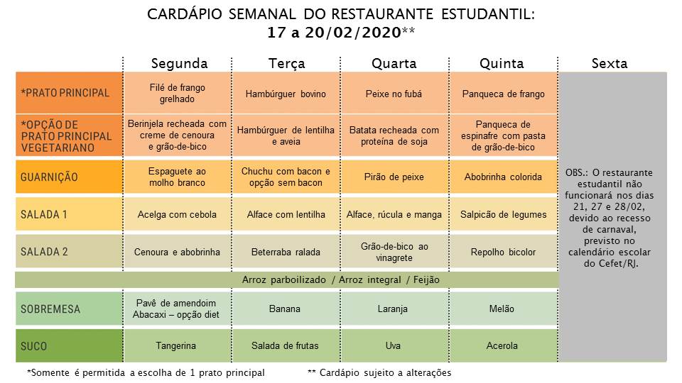 O restaurante estudantil divulga o cardápio para o período de 17 a 20/02/2020: