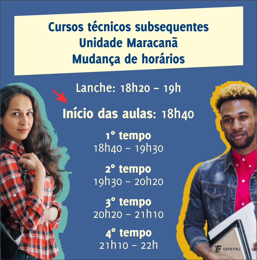 O Departamento de Ensino Médio e Técnico (DEMET) informa as seguintes mudanças de horários para os cursos técnicos subsequentes da Unidade Maracanã: