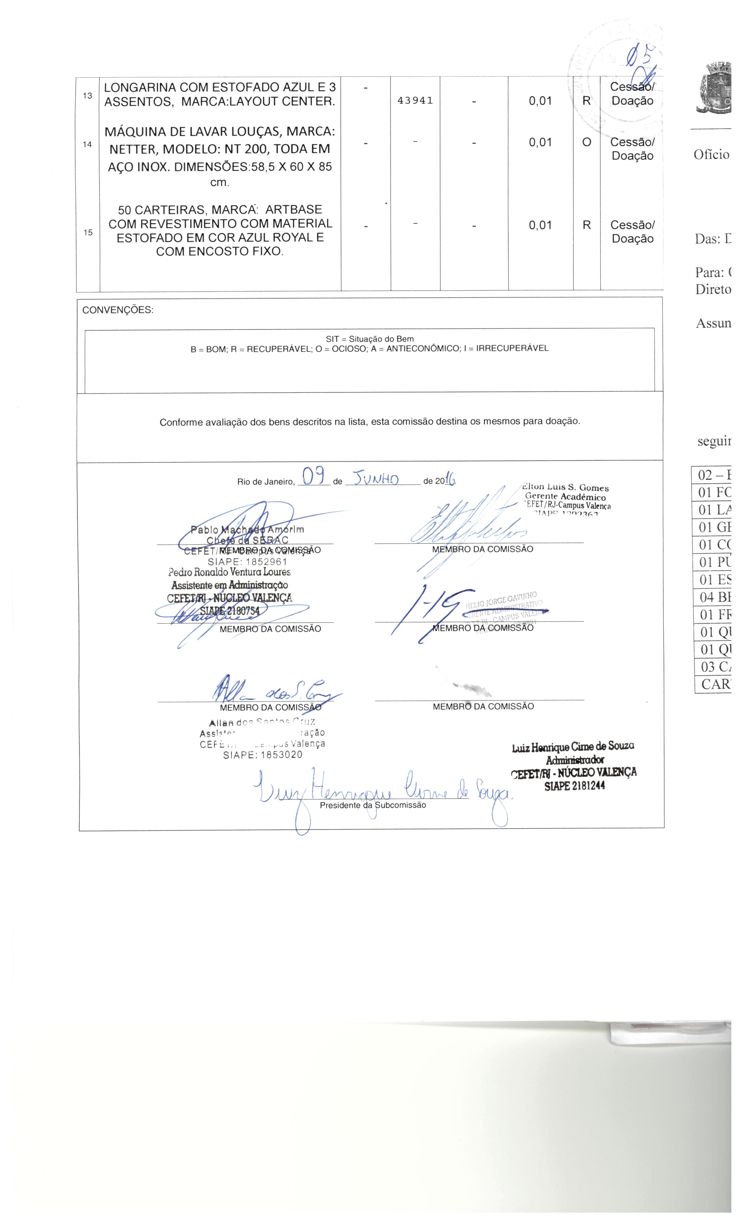 O campus Valença divulga a lista de bens inservíveis à disposição, para amplo conhecimento de todos os campi. O processo de cessão, para posterior doação, já foi autorizado para uma escola municipal da cidade. Os interessados devem entrar em contato por e-mail, memorando ou pessoalmente, especificando os bens de interesse. Após 30 dias, a contar da data de publicação deste aviso, os bens que não forem movimentados internamente serão destinados à movimentação externa através de processos de desfazimento de bens.