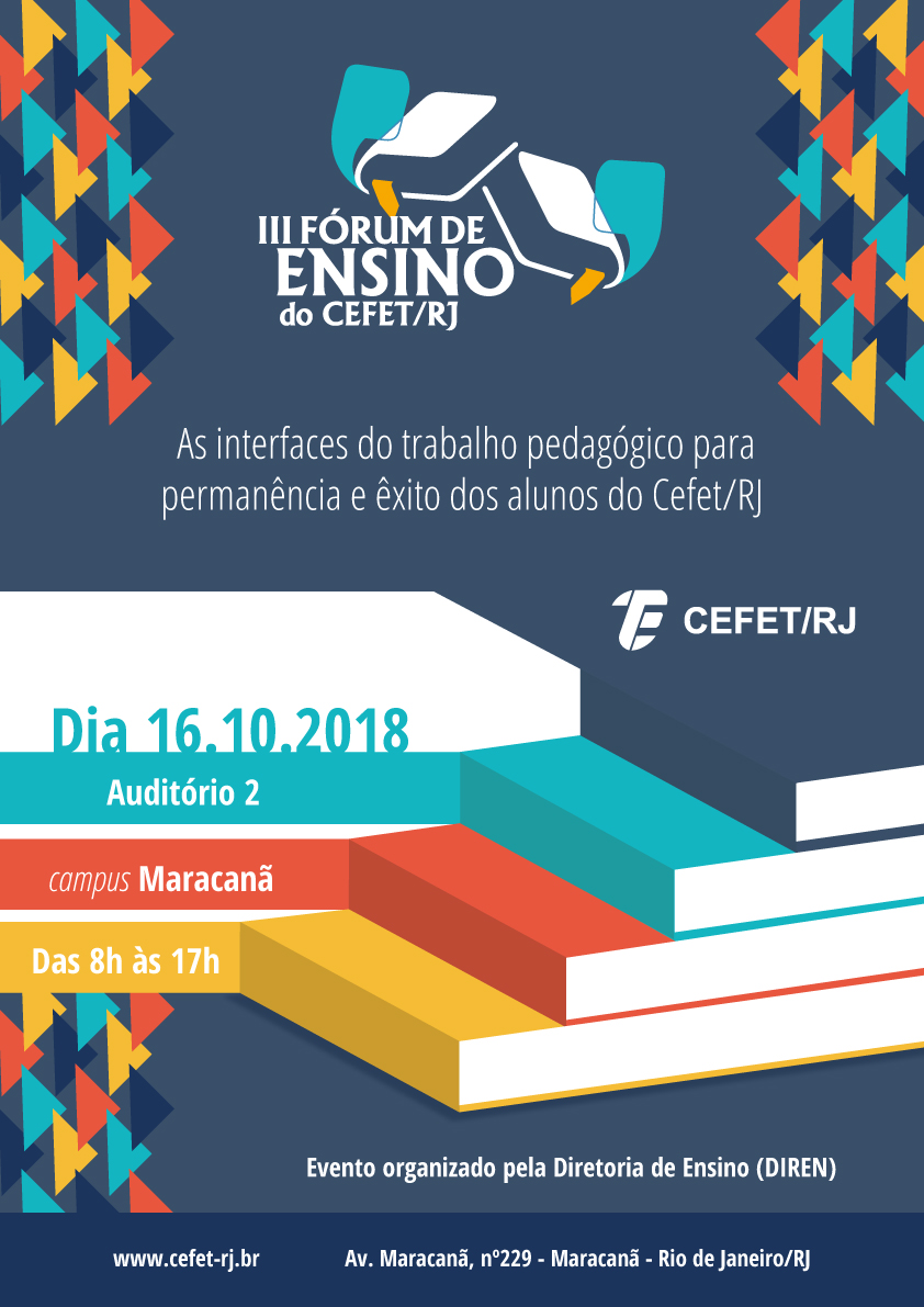 A Diretoria de Ensino (DIREN) convida para o III Fórum de Ensino do sistema Cefet/RJ que, este ano, terá como temática "As interfaces do trabalho pedagógico para permanência dos alunos do Sistema Cefet/RJ". O evento acontecerá no dia 16 de outubro de 2018, no Auditório 2 do campus Maracanã.