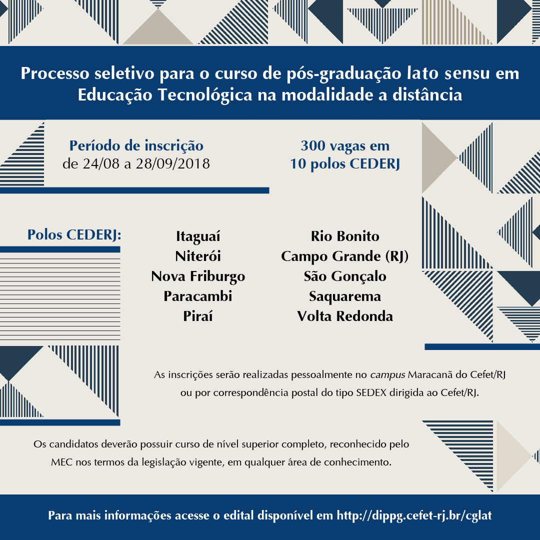Seguem abertas, até o dia 28/09/2018, as inscrições para o edital COLAT nº 03/2018 referente à seleção discente para o curso de pós-graduação lato sensu em Educação Tecnológica (Educação a Distância – EAD). O curso será oferecido por meio de convênio entre o Cefet/RJ campus Maracanã, a Universidade Aberta do Brasil (UAB) e o CEDERJ, num total de 300 vagas em 10 polos.