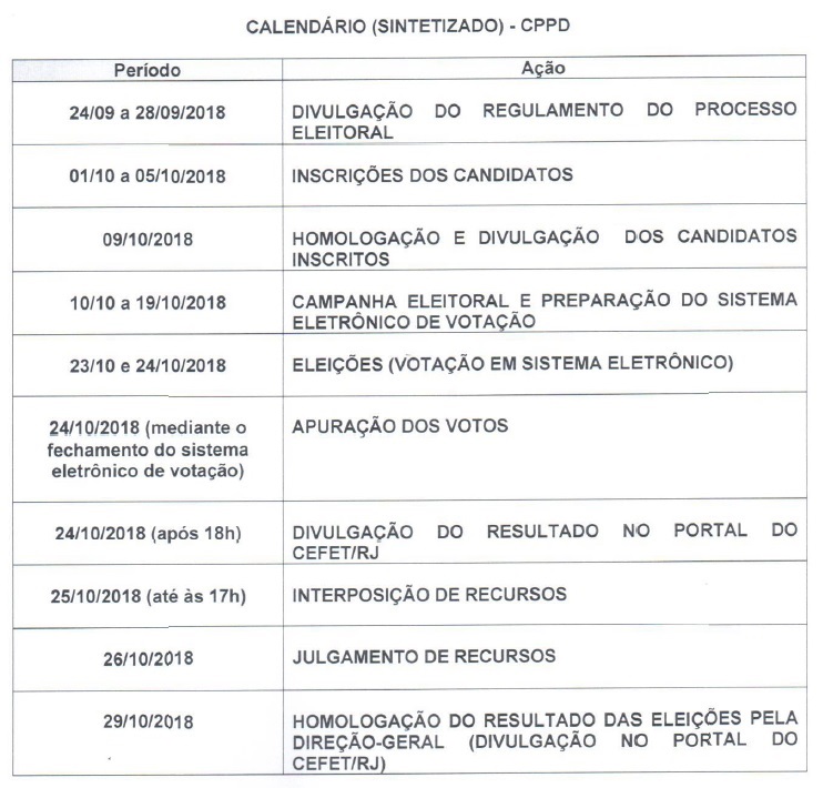 O diretor-geral do Centro Federal de Educação Tecnológica Celso Suckow da Fonseca (Cefet/RJ) divulga a Portaria nº 1.182, de 20 de setembro de 2018, que contém o regulamento e o calendário das eleições visando à escolha dos representantes docentes das carreiras do Magistério Superior e do Magistério do Ensino Básico, Técnico e Tecnológico na Comissão Permanente de Pessoal Docente (CPPD).