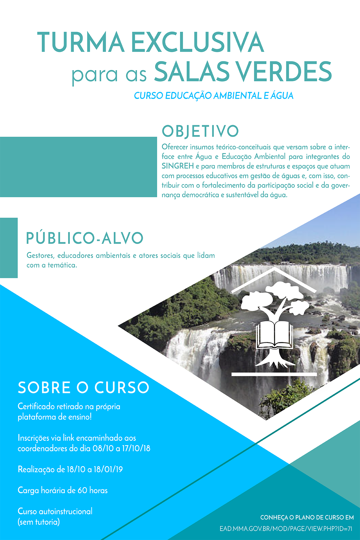 A Divisão de Estratégia para Sustentabilidade Ambiental Institucional (DISAI) informa aos servidores e alunos do Cefet/RJ que, em outubro, haverá a oferta de mais um curso do Projeto Sala Verde: o curso de Educação Ambiental e Água, disponível na plataforma de educação a distância do Ministério do Meio Ambiente.