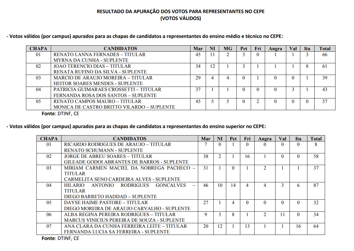 Resultado da apuração dos votos para representantes docentes no CEPE