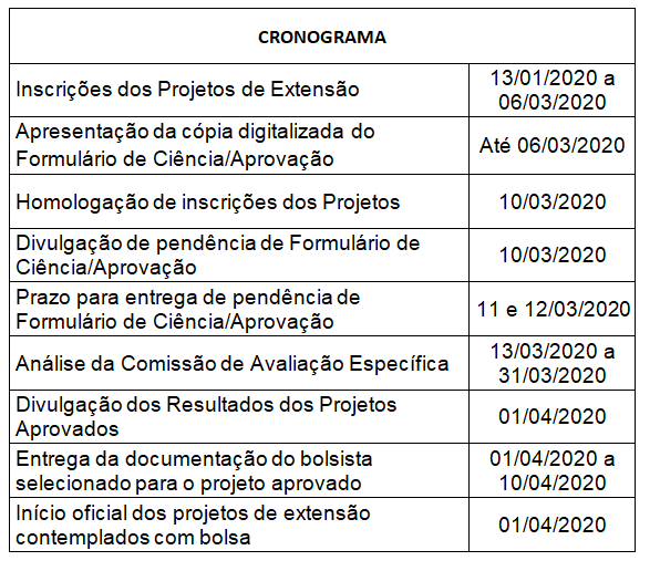 O Departamento de Extensão e Assuntos Comunitários (DEAC) informa que as inscrições para projetos e bolsas de extensão (PBEXT e PBEXT-DH) foram prorrogadas até o dia 06/03/2020. Confira o calendário alterado: