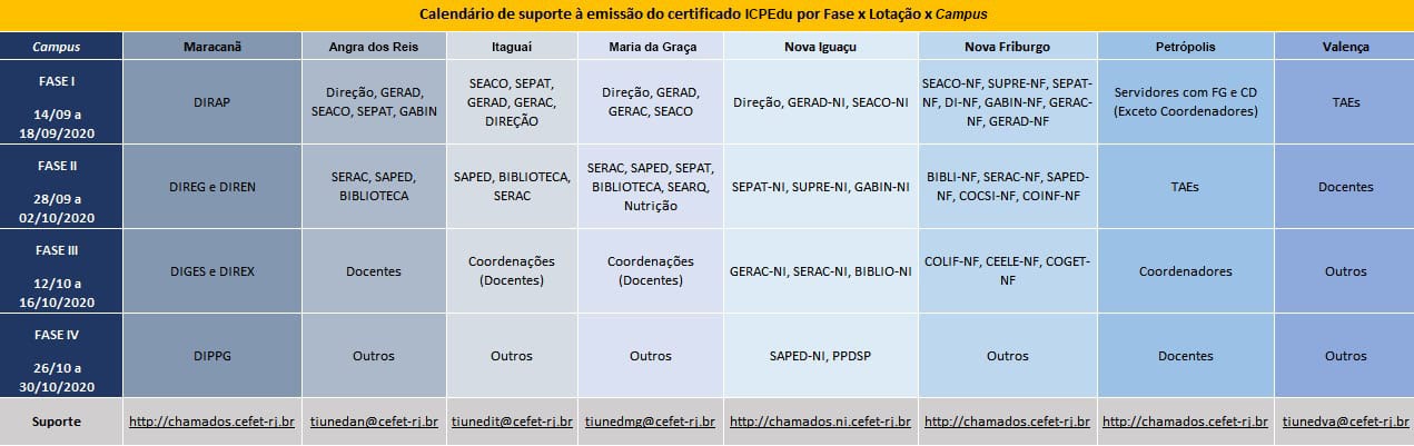 O Departamento de Tecnologia da Informação (DTINF) do Cefet/RJ divulgou, nesta sexta-feira (11), o calendário de suporte à emissão do certificado digital ICPEdu. Esse certificado é restrito ao uso educacional e não possui atributos (não funciona) para acesso a sistemas governamentais como o ComprasNet, SIAPE, SIAFI, Sigepe, Serpro, entre outros. Para esses sistemas, é necessário verificar com o Departamento de Administração (DEPAD) do Cefet/RJ a viabilidade para a aquisição de um certificado digital com token.