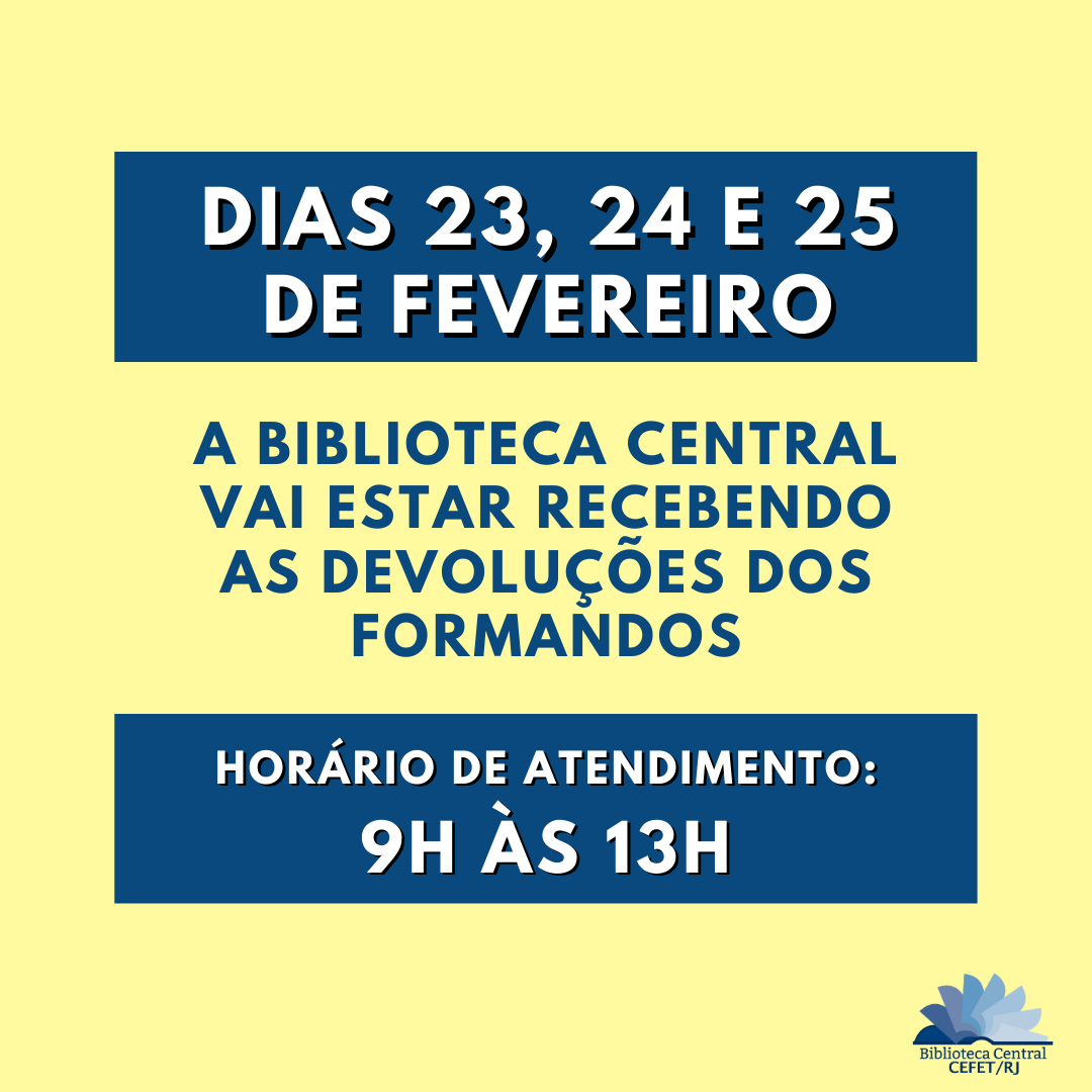A Biblioteca Central (BIBCE) do Cefet/RJ comunica a todos os formandos que, para prosseguir com o processo de conclusão de curso, é necessário devolver os livros emprestados pela Biblioteca. Portanto, excepcionalmente nos dias 23, 24 e 25 de fevereiro, a Biblioteca receberá os livros em horário especial, das 9h às 13h.