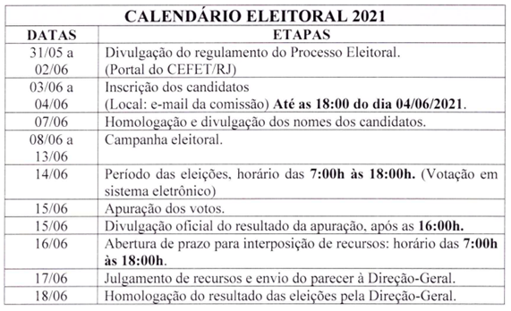O diretor-geral do Cefet/RJ, Mauricio Saldanha Motta, divulga o Regulamento para a escolha dos representantes docentes do Cefet/RJ na Comissão Permanente de Pessoal Docente (CPPD) e, também, a Portaria nº 404, de 11 de maio de 2021, que designa os servidores que irão compor a Comissão Eleitoral para a escolha dos representantes nessa CPPD, conforme estabelecido na Portaria nº 495, de 31 de maio de 2021.