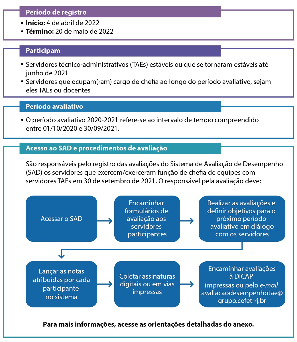 A Divisão de Capacitação e Desenvolvimento (DICAP/DGP) informa que, devido à grande incidência de erros no Sistema de Avaliação de Desempenho e à alta demanda de suporte para concluir o processo avaliativo, a data final para registro das avaliações dos servidores técnico-administrativos estáveis e gestores, referente ao período 2020-2021, foi adiada para 20/05/2022.