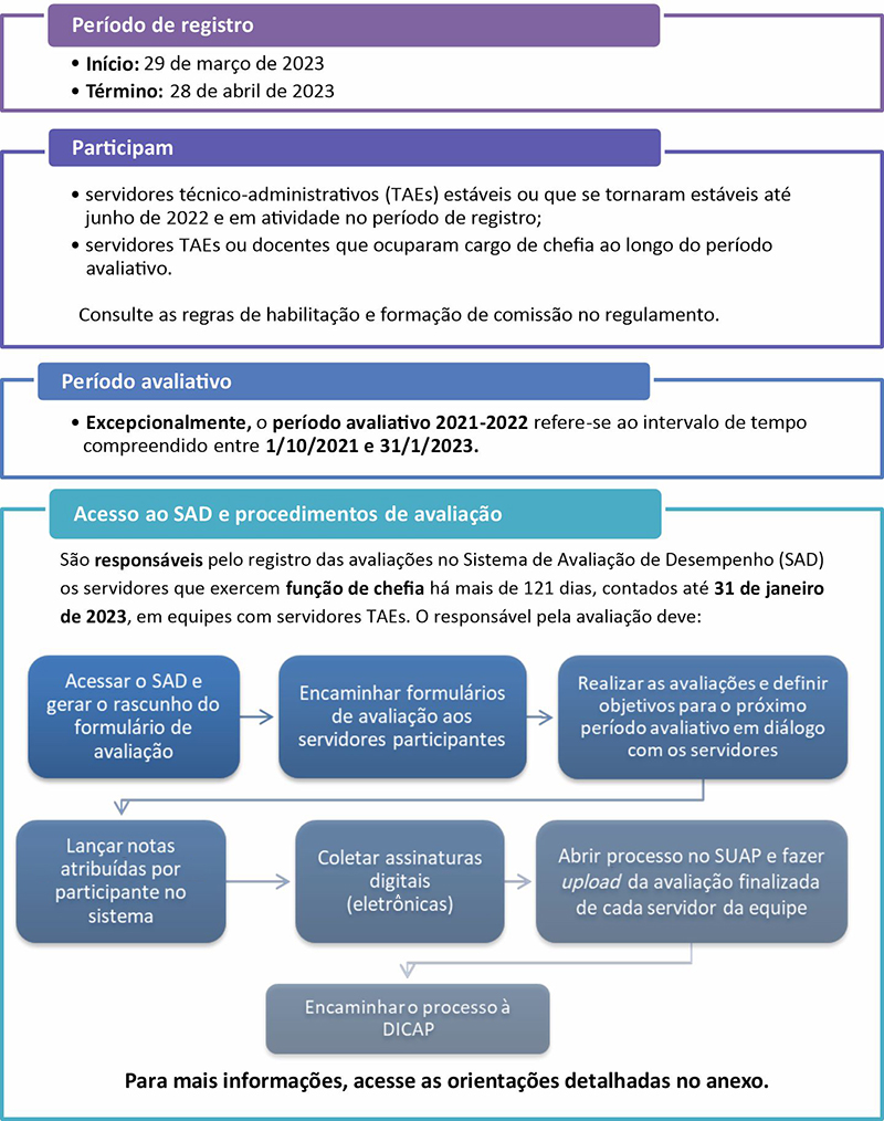 A Divisão de Capacitação e Desenvolvimento (DICAP/DGP) reitera que encerra, nesta sexta-feira, 28/4/2023, o período de registro das avaliações de desempenho dos servidores técnico-administrativos estáveis e dos gestores, referente ao ciclo 2021-2022.