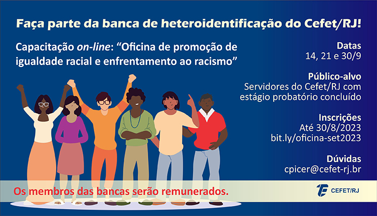 Estão abertas, até 30 de agosto, as inscrições para a capacitação on-line “Oficina de promoção de igualdade racial e enfrentamento ao racismo”. A atividade é voltada a servidores do Cefet/RJ, com estágio probatório concluído, que tenham interesse em participar de bancas de heteroidentificação para atuar na verificação da autodeclaração étnico-racial dos candidatos às vagas reservadas pela Lei de Cotas nos processos seletivos da instituição. As inscrições podem ser feitas pelo link bit.ly/oficina-set2023.