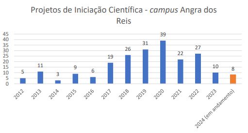 Os alunos dos cursos de graduação e do curso técnico do Cefet/RJ campus Angra dos Reis são constantemente incentivados a se engajarem nas atividades de pesquisa, visto que a pesquisa científica poderá acrescentar ganhos significativos na formação acadêmica do estudante, além de proporcionar uma maior capacidade de análise e reflexão sobre problemas que poderão surgir no exercício da profissão, bem como em questões sociais. A seguir, apresentamos a evolução do quantitativo de projetos de Iniciação Científica realizados no campus Angra dos Reis.