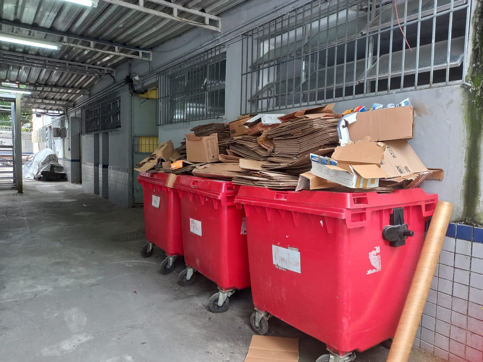 A definição dos espaços onde ficam os coletores de lixo reciclável e não reciclável se fez por meio de um mapeamento dos locais disponíveis para a instalação dos coletores. Os recicláveis retirados dos coletores de 50 litros e recolhidos nas salas administrativas são depositados em uma área específica temporariamente. Os PAPELÕES em containers de 1000 litros (Figura 4) que se encontram em um local coberto e protegido das intempéries. E PAPÉIS, PLÁSTICOS E ELETRÔNICOS também são guardados (Figura 5). Para depois serem retirados pela cooperativa de catadores habilitada.