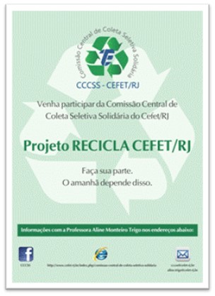 O Centro Federal de Educação Tecnológica Celso Suckow da Fonseca (Cefet/RJ), campus Maracanã, aderiu no ano de 2012 ao Decreto 5.940 / 2006, que consiste na doação de resíduos recicláveis gerados por órgãos e entidades da Administração Pública Federal direta e indireta para cooperativas ou associações de catadores de recicláveis, a partir da homologação da Portaria 826, de 17 de Outubro de 2012, que designava servidores para comporem a COMISSÃO CENTRAL DE COLETA SELETIVA SOLIDÁRIA (CCCSS) no campus Maracanã. Contudo, apenas em agosto de 2015, que se verificou, na prática, a implementação da COLETA SELETIVA SOLIDÁRIA NO CAMPUS MARACANÃ com o desenvolvimento do PROJETO RECICLA CEFET/RJ (Figura 1).