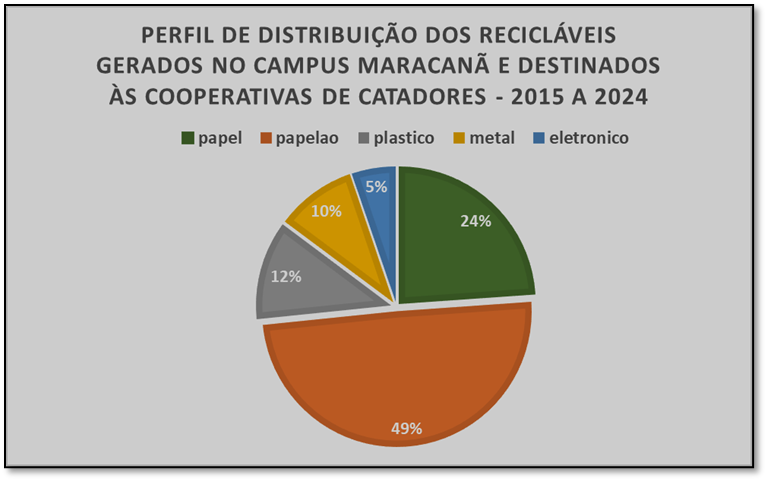 Em termos percentuais, verifica-se a maior participação do papelão e papel em relação aos demais recicláveis (Figura 7) que são gerados no campus Maracanã do Cefet/RJ e destinados às cooperativas, durante o período de 2015 a 2024.