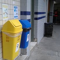 Instalou-se pelo campus dois tipos de coletores: o coletor amarelo de 50 litros para lixo reciclável (ou lixo seco) e o coletor azul de 50 litros para lixo não reciclável (ou lixo úmido) - Figura 3. Antes do projeto, já havia coletores azuis na instituição que armazenavam todos os tipos de lixo; então, escolhemos um coletor com uma cor que diferenciasse e armazenasse os recicláveis.