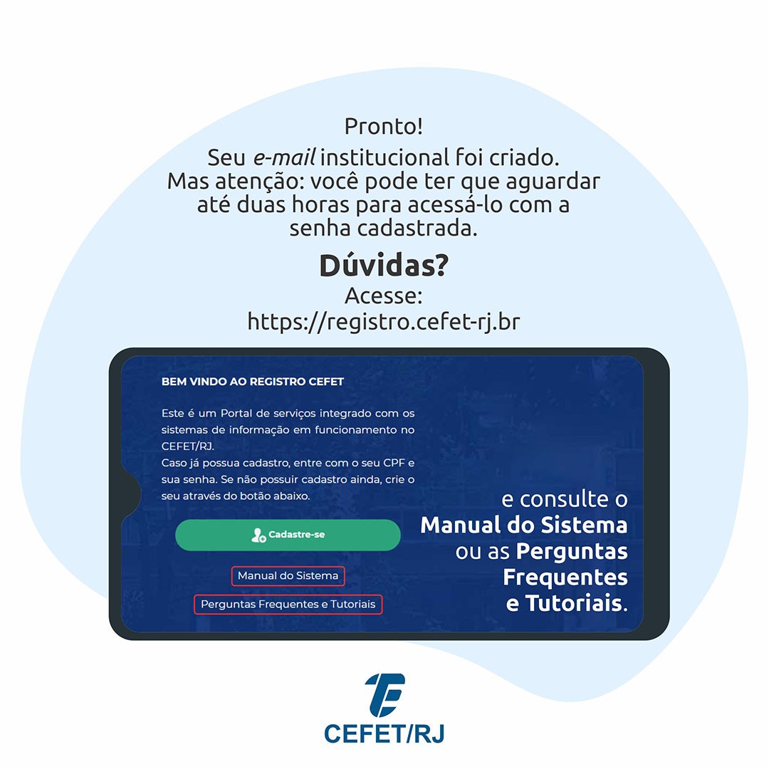 O Cefet/RJ disponibilizou, nesta terça-feira (18), o passo a passo para auxiliar os estudantes na criação do e-mail institucional. O material ilustrativo foi elaborado pela Divisão de Programação Visual do Cefet/RJ (DPROV), em parceria com a Assessoria de Comunicação (ASCOM). A Diretoria de Ensino (DIREN) solicita que os estudantes de todos os campi do Sistema Cefet/RJ criem ou atualizem os seus e-mails institucionais para terem acesso às atividades pedagógicas não presenciais mediadas por tecnologia digital.