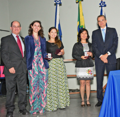 O destaque da solenidade em comemoração do centenário do Cefet/RJ, que ocorreu nesta sexta-feira, no campus Maracanã, foi o lançamento oficial da medalha comemorativa cunhada pela Casa da Moeda para homenagear a instituição. Logo após a abertura do evento, com os pronunciamentos do diretor-geral do Cefet/RJ, Carlos Henrique Figueiredo Alves, e do presidente da Comissão do Centenário, Mauricio Saldanha Motta, o representante da Casa da Moeda, Jehovah de Araújo Silva Júnior, realizou a entrega das medalhas comemorativas. Foram agraciados o diretor Carlos Henrique e o vice-diretor Mauricio Motta, o Arquivo Geral da instituição, além das três funcionárias responsáveis pelo design da medalha: Erika Takeyama, da Casa da Moeda, e Isabela Devonish e Thaís Pires Alves, ambas da Divisão de Programação Visual do Cefet/RJ.