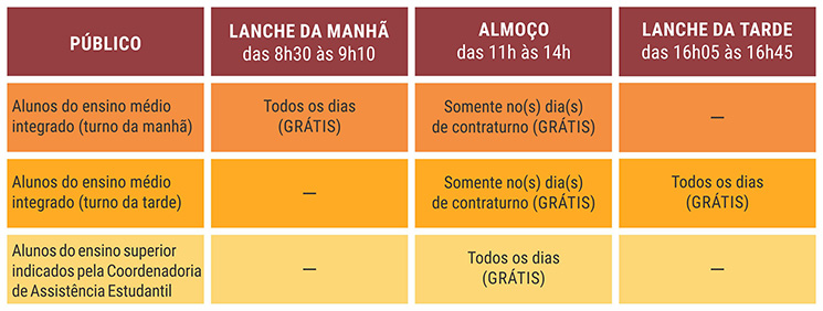 Demais usuários – Para ter acesso ao restaurante no almoço, os demais alunos do Cefet/RJ precisarão apresentar a carteira de estudante ou o comprovante de matrícula e um documento oficial com foto. Já os servidores e funcionários terceirizados precisarão apresentar o crachá ou a carteira funcional, disponível no aplicativo Sigepe. O restaurante não poderá ser utilizado pelo público externo.