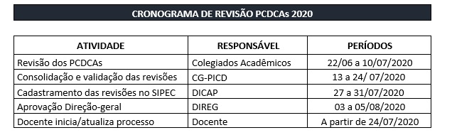 Os procedimentos a serem seguidos pelos colegiados para efetuar esta revisão, bem como o formulário para a revisão do PCDCA, podem ser acessados através do link: Revisão PCDCAs 2020 – COVID-19