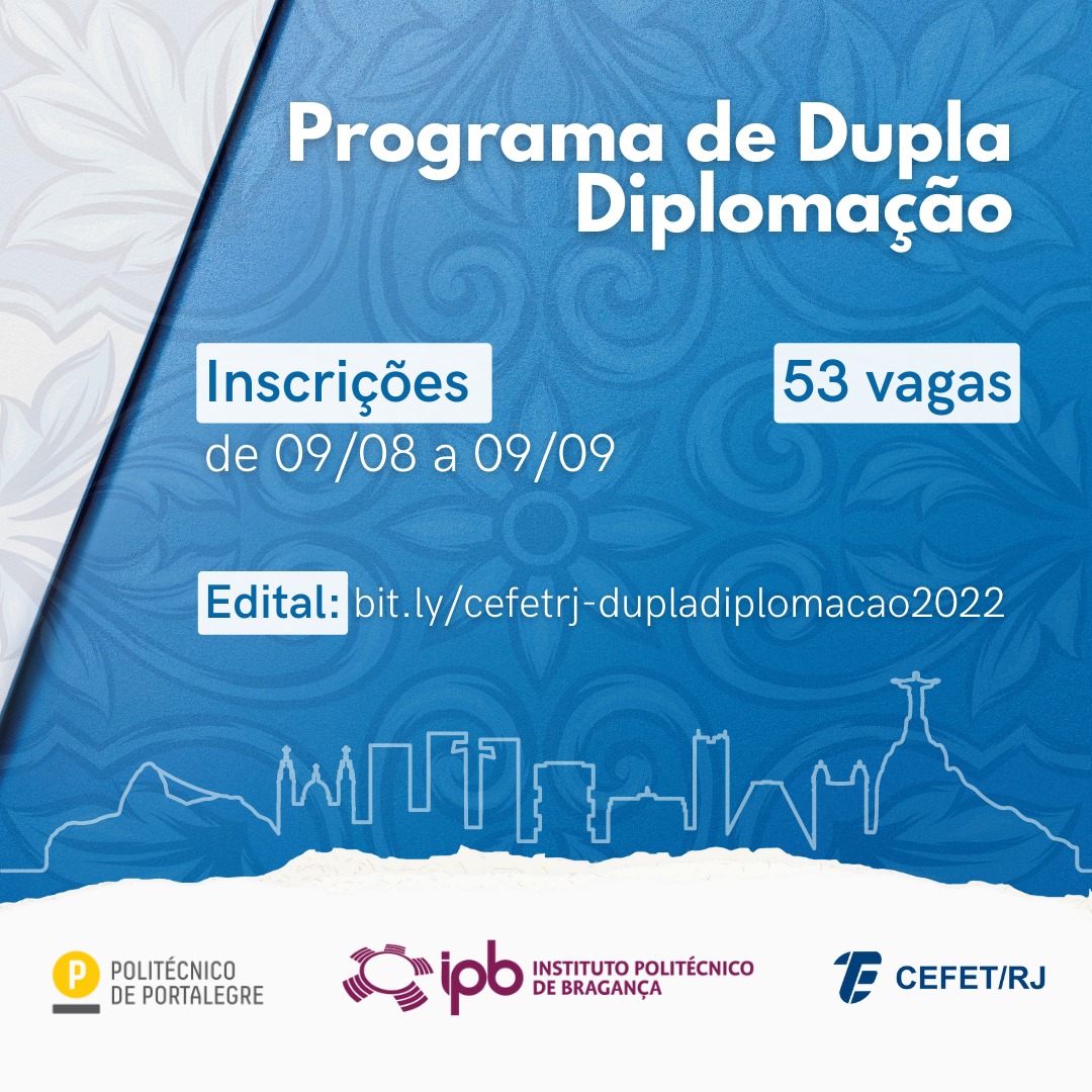 A Assessoria de Cooperação e Relações Internacionais (ASCRI) divulga o edital do Programa de Dupla Diplomação, envolvendo o Cefet/RJ e os Institutos Politécnicos de Bragança (IPB) e de Portalegre (IPPortalegre).