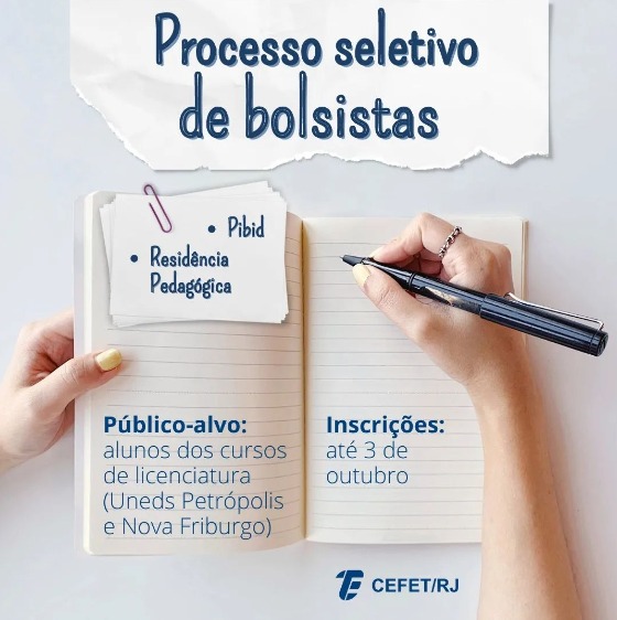 Estão abertas, até o dia 03/10, as inscrições para bolsistas do Programa Institucional de Bolsa de Iniciação à Docência (Pibid) e do Programa de Residência Pedagógica do Cefet/RJ.