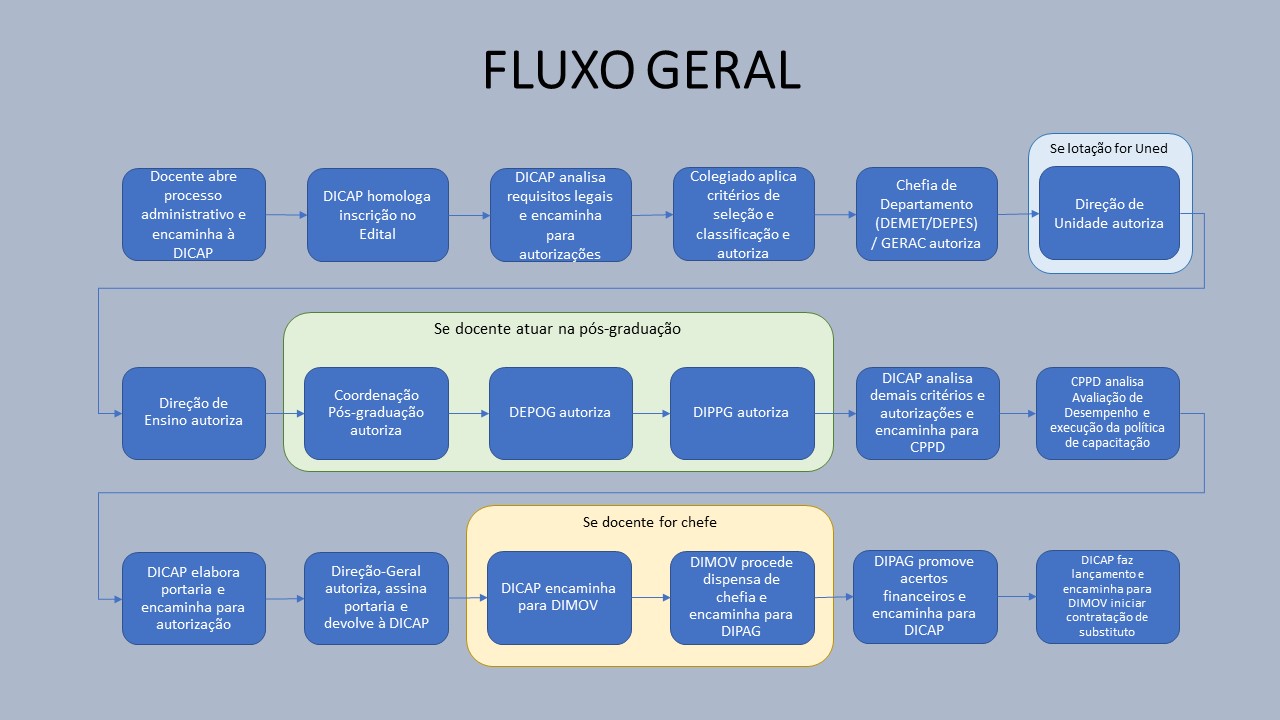 O fluxo do processo está representado na imagem abaixo. A tramitação do processo no SUAP para as autorizações parciais deve ser feita diretamente para as instâncias de autorização, sem passagem pela DICAP. Após as autorizações, DIREN ou DIPPG encaminham o processo para análise da DICAP.