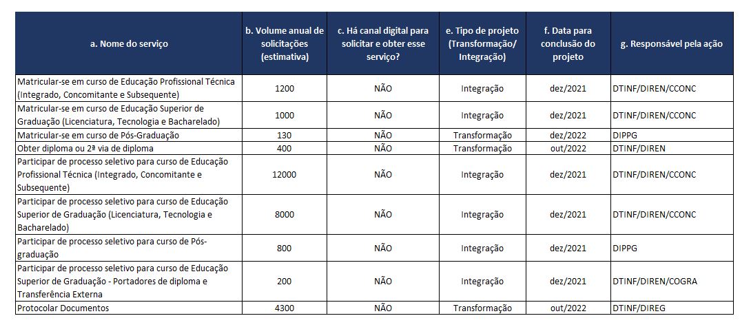 O PTD pactuado com a Secretaria de Governo Digital do Ministério da Economia previu a integração da plataforma Gov.br à carta de serviços da Instituição que abrange inscrição em processos seletivos e matrículas em todos os níveis de ensino, solicitação de diploma e o recurso de protocolar documentos.