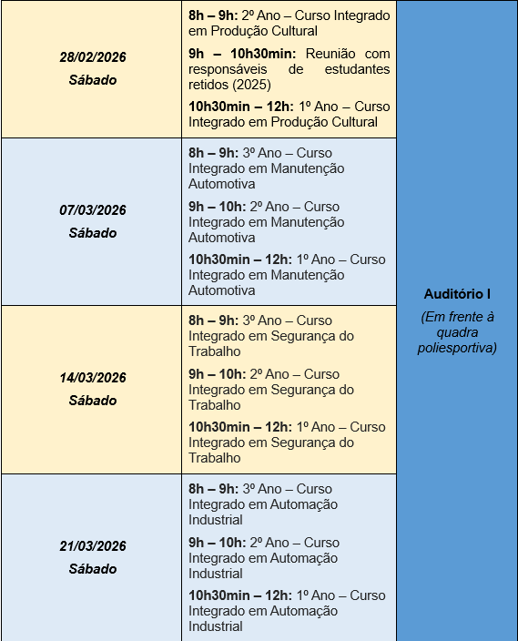 Conforme previsto em nosso Calendário Letivo de 2026, compartilhamos o cronograma de encontros a seguir: