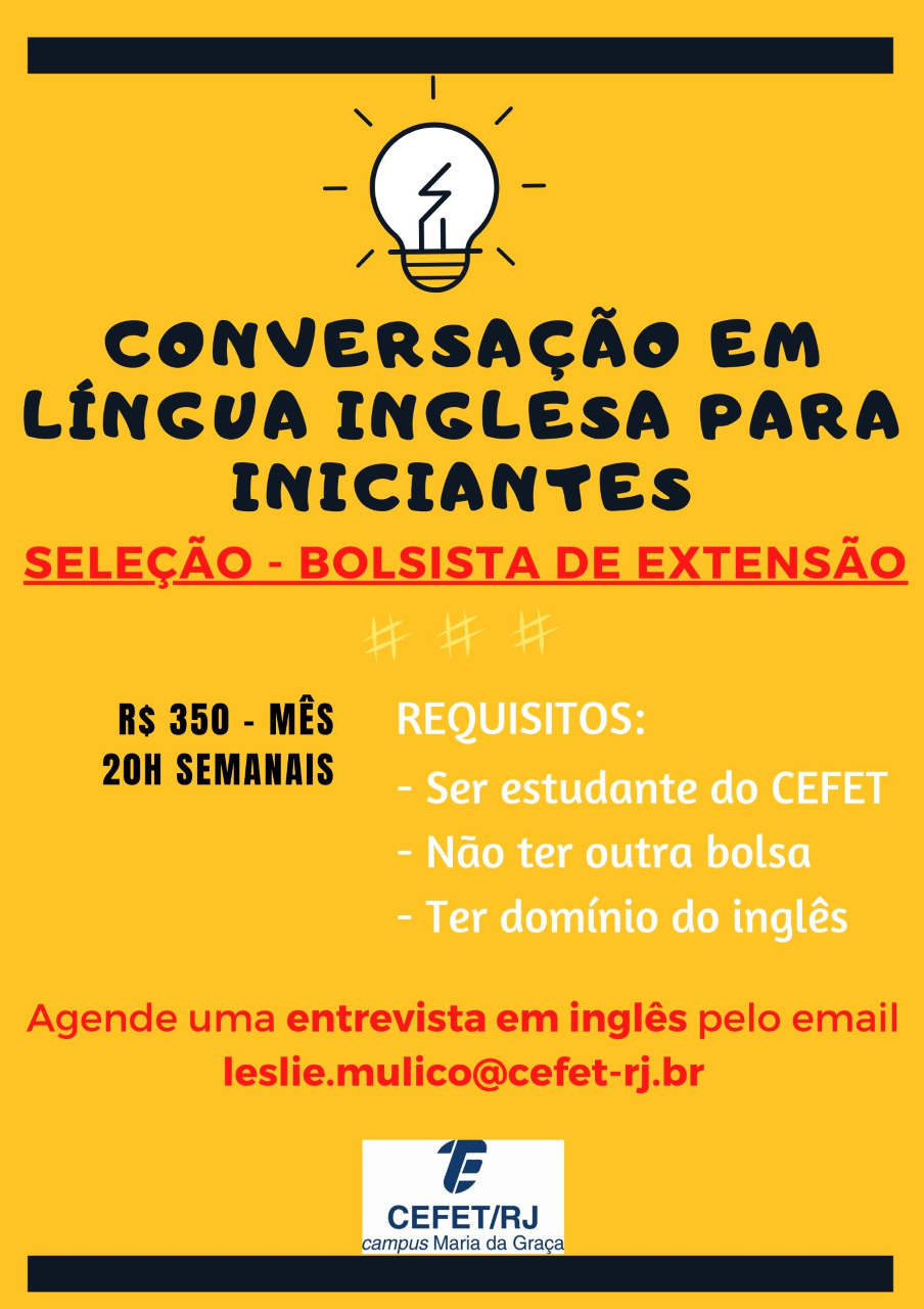 O Projeto de Extensão Conversação em Língua Inglesa para Iniciantes está selecionando 1 estudante do Cefet/RJ campus Maria da Graça para atuar na extensão em língua inglesa em nosso campus. Procuramos um(a) aluna(a) com perfil especificado no cartaz.