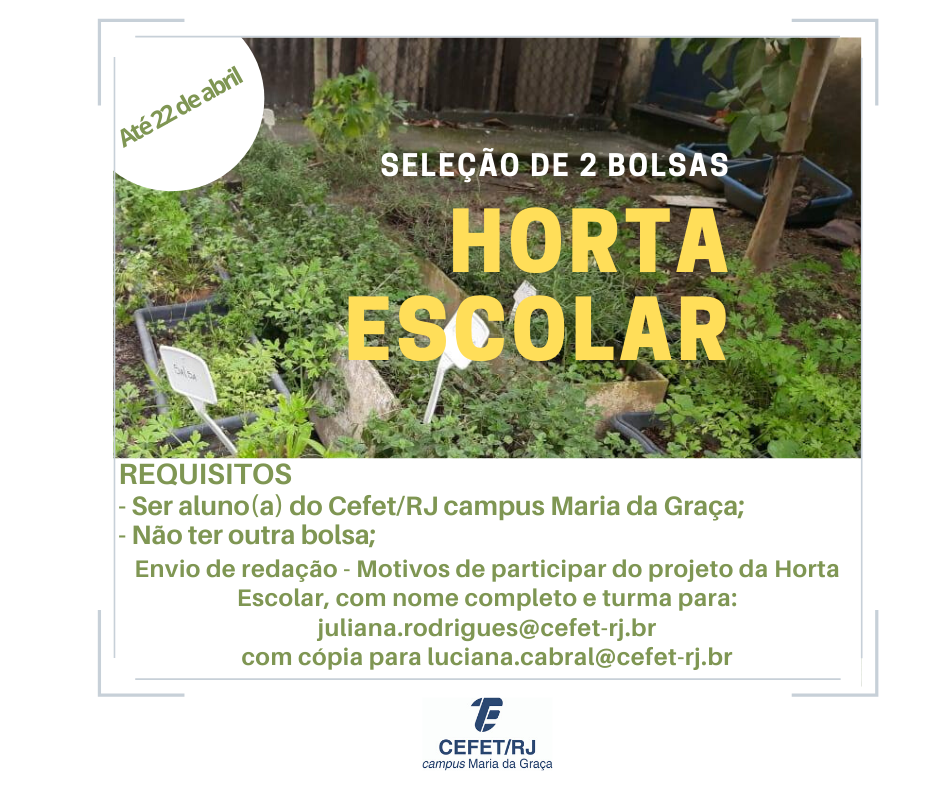O Cefet/RJ campus Maria da Graça foi contemplado com 1 bolsa de extensão e 1 bolsa de pesquisa. A bolsa de extensão será para cuidar de todos os projetos relacionados ao projeto-mãe Horta Escolar, incluindo as atividades de manutenção da horta, e a de pesquisa será para fazer uma Revisão Sistemática de Atividades de Educação Nutricional em Hortas Escolares. Interessados(as) deverão enviar para o email O endereço de e-mail address está sendo protegido de spambots. Você precisa ativar o JavaScript enabled para vê-lo. com cópia para O endereço de e-mail address está sendo protegido de spambots. Você precisa ativar o JavaScript enabled para vê-lo. uma redação falando sobre os motivos de participar do projeto da horta escolar, com nome completo e turma. Prazo: 22/04!
