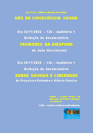 Nos dias 23 e 25 de novembro, NEABI da Uned Maria da Graça irá exibir dois documentários: "Tambores da Diáspora" e "Sobre Sonhos e Liberdade".