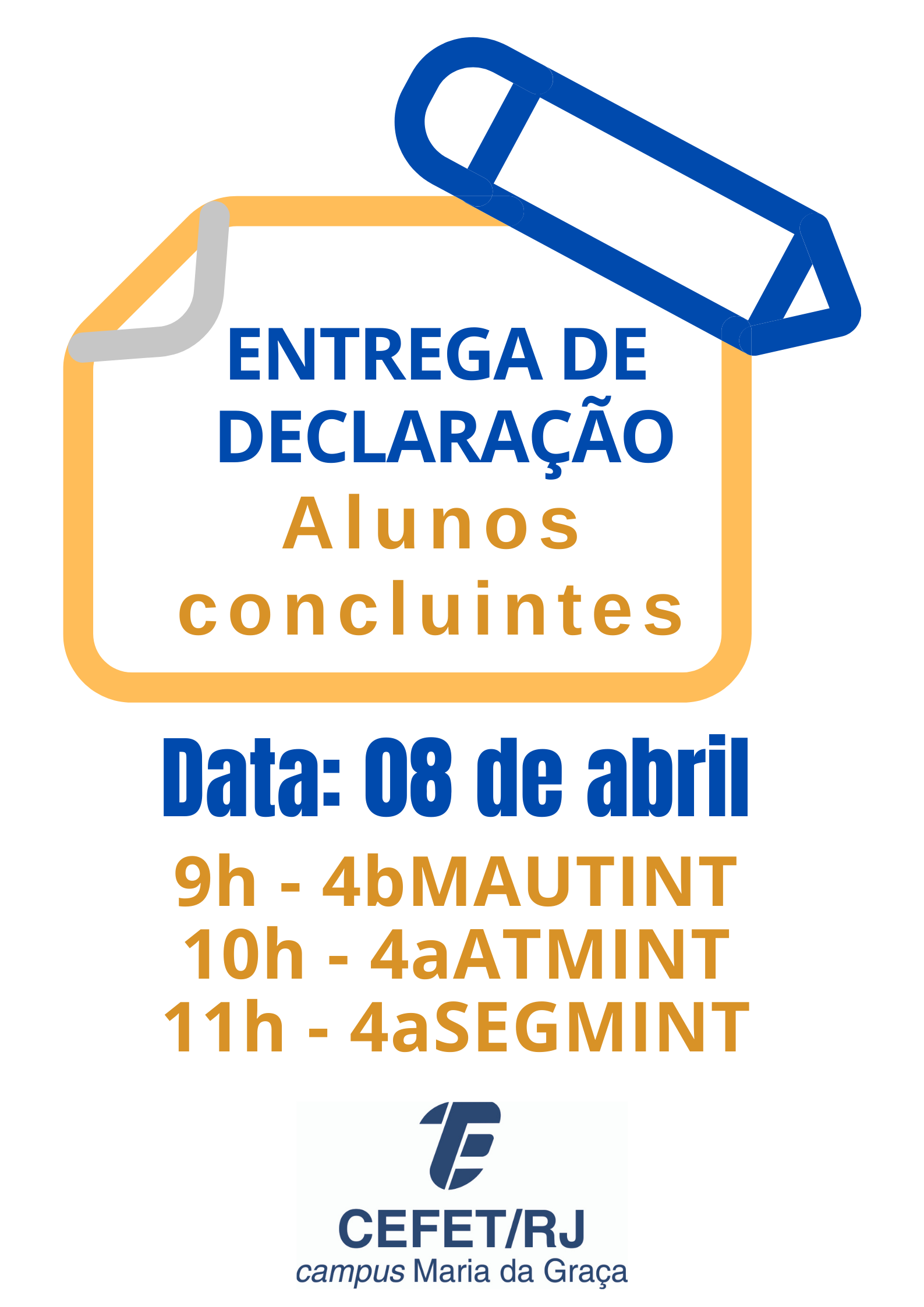 Prezados alunos e/ou responsáveis legais, A Secretaria do campus Maria da Graça se organizou para entregar todas as declarações dos alunos concluintes no dia 08/04/2021. Todos...