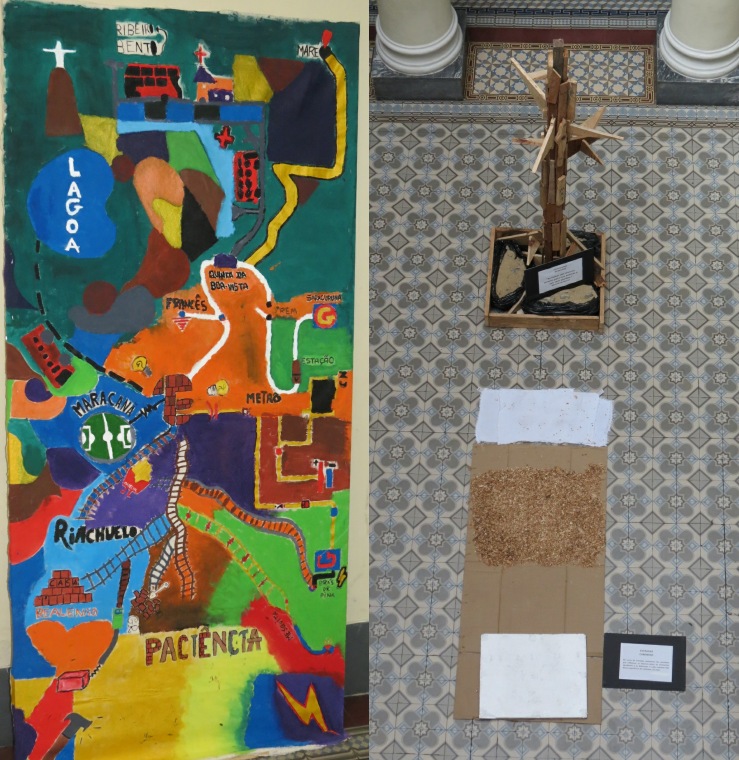 Pintura tendo o Cefet/RJ como ponto de encontro no Rio de Janeiro (esquerda) e escultura "Reárvore", criada com materiais descartados em construções (esquerda).