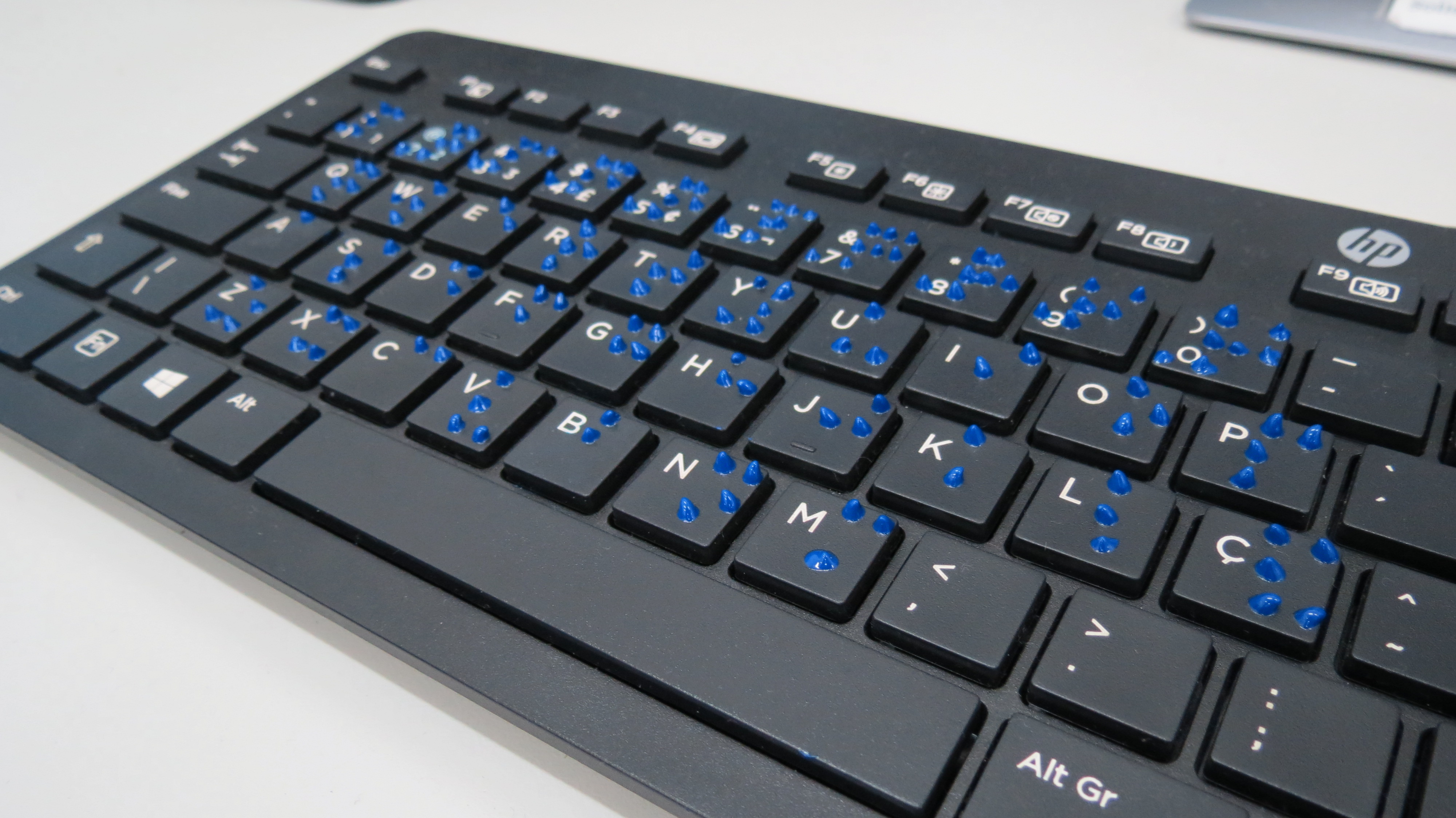 Alguns teclados do Laboratório de Informática foram adaptados para o braile com o uso de cola autorelevo.
