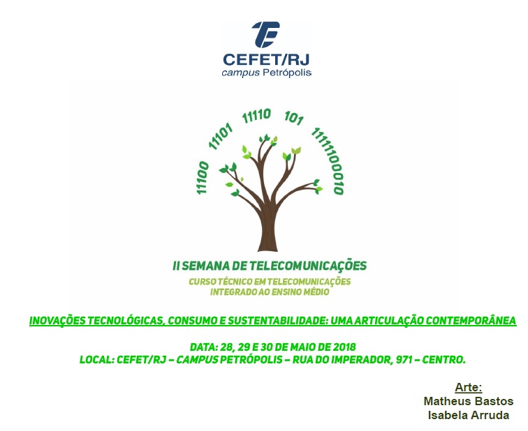 De 28 a 30 de maio, o Cefet/RJ campus Petrópolis promove a 2ª edição da Semana do Curso Técnico em Telecomunicações Integrado ao Ensino Médio. Na programação, palestras, minicursos, apresentação de pôsteres e mesa-redonda.