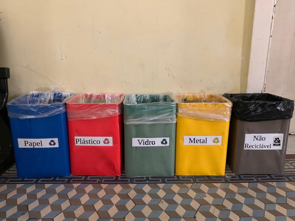 Coletores, divididos conforme o material, estão presentes em todo campus