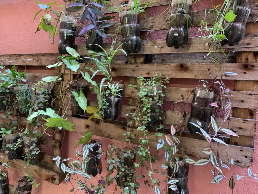 Jardim vertical do projeto: as garrafas Pet usadas têm um sistema que impede o acúmulo de água parada