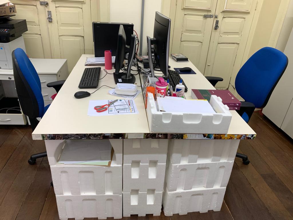 Mesa de trabalho construída com pedaços de isopor e portas reaproveitadas