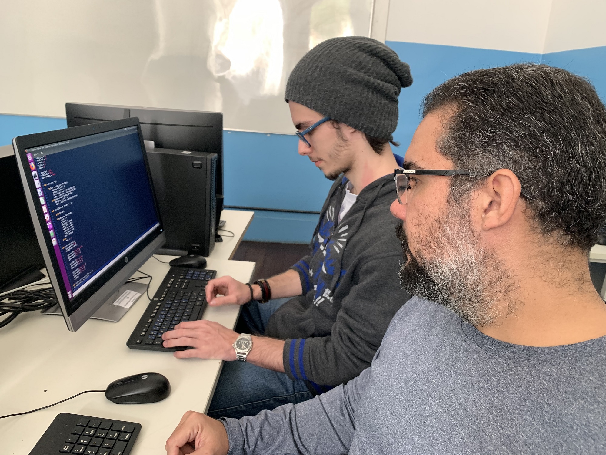 O estudante Caio Christian trabalha em projeto de iniciação científica ao lado professor Felipe Henriques