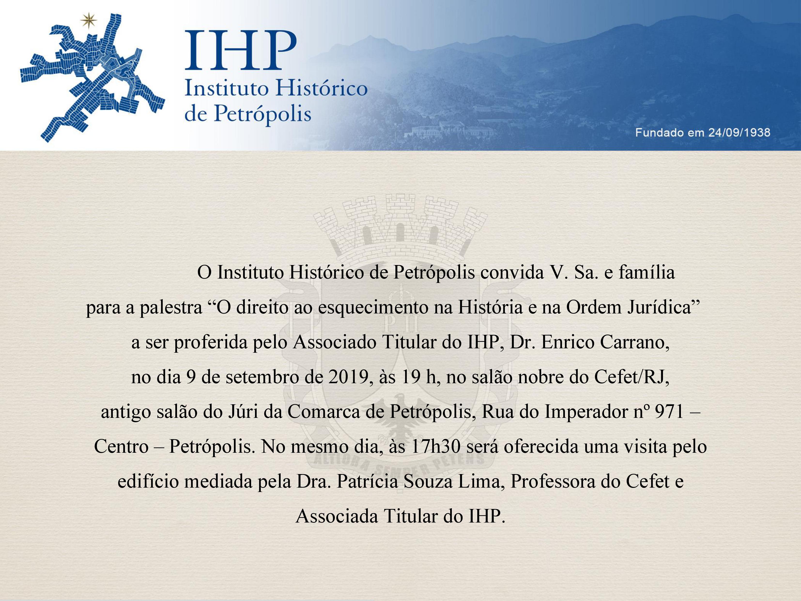 A palestra “O direito ao esquecimento na História e na Ordem Jurídica” faz parte da sessão ordinária do Instituto Histórico de Petrópolis (IHP) e será ministrada pelo associado titular do IHP Enrico Carrano. A escolha do Salão Nobre do Cefet/RJ campus Petrópolis para a realização do evento remonta ao fato de que o espaço é o antigo salão do Júri da Comarca de Petrópolis.